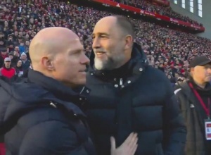 观众们注意到,随后图多尔迅速看向利物浦的替补席,并伸出手走了过去。不过摄像机并没有拍到图多尔此后是否直接上前和斯洛特打招呼,尽管二人被拍到在赛前拥抱致意。