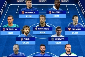 中场:德西利奥(AC米兰,1200万)、皮尔洛(尤文图斯,750万)、马尔基西奥(尤文图斯,2800万)、维拉蒂(巴黎圣日耳曼,2000万)、达米安(都灵,450万)
