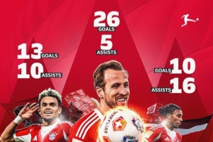 体育资讯2月20日讯 德甲官方更新社媒动态,晒出拜仁锋线三叉戟本赛季的联赛数据,配文:“拜仁拥有世界最佳锋线三人组吗?”