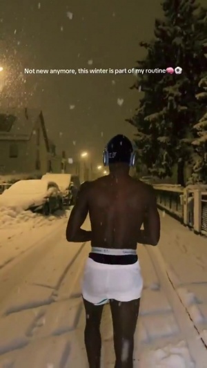 视频中杰克逊全身赤裸,只穿着一条短裤,他还配文:冬天已经不再新鲜了,它现在是我日常的一部分。