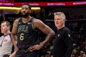 鹈鹕内线小乔丹本场比赛先发出战在攻防两端都有不错发挥,拼抢前场篮板依旧给力,防守也是多次送出封盖,最后时刻勇士采用“砍鲨战术”被提前换下。